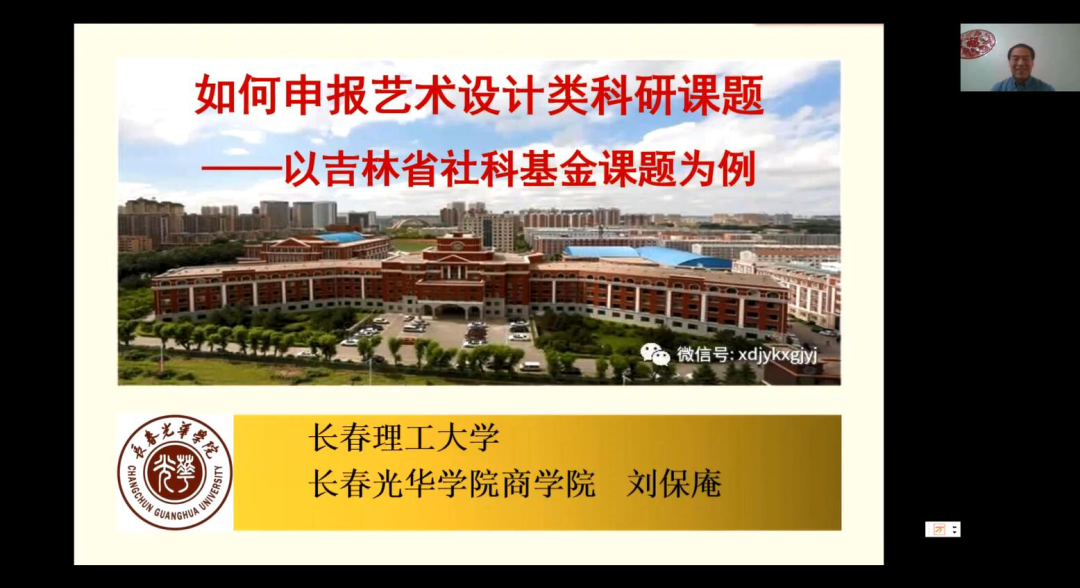为进一步提高艺术设计学院教师科研工作的认知和提升科研能力,增强艺术设计学院科研学术氛围,2021年2月24日上午,艺术设计学院邀请我校商学院刘保庵教授,通过腾讯会议平台,以《如何申报艺术设计类科研课题》主题讲座,我院全体教师人员参加此次培训。