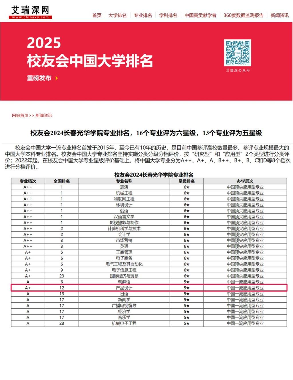 在艾瑞深校友会 2025 中国大学产品设计专业排名(应用型)中,其被评为 A + (5★)级,评级位列全国排名第 12名,稳居全国同类专业前列,明确跻身于“中国一流应用型专业” 行列。这一排名由第三方评价机构艾瑞深校友会网发布,其评价体系涵盖学科水平、培养质量、师资水平、专业水平与专业影响力 5 大核心指标,整合了教育部学科评估结果、国家级一流本科专业建设点、杰出校友等 100 余项观测数据,是目前国内参评高校数量最多、专业规模最大的本科专业,具有广泛的社会公信力。