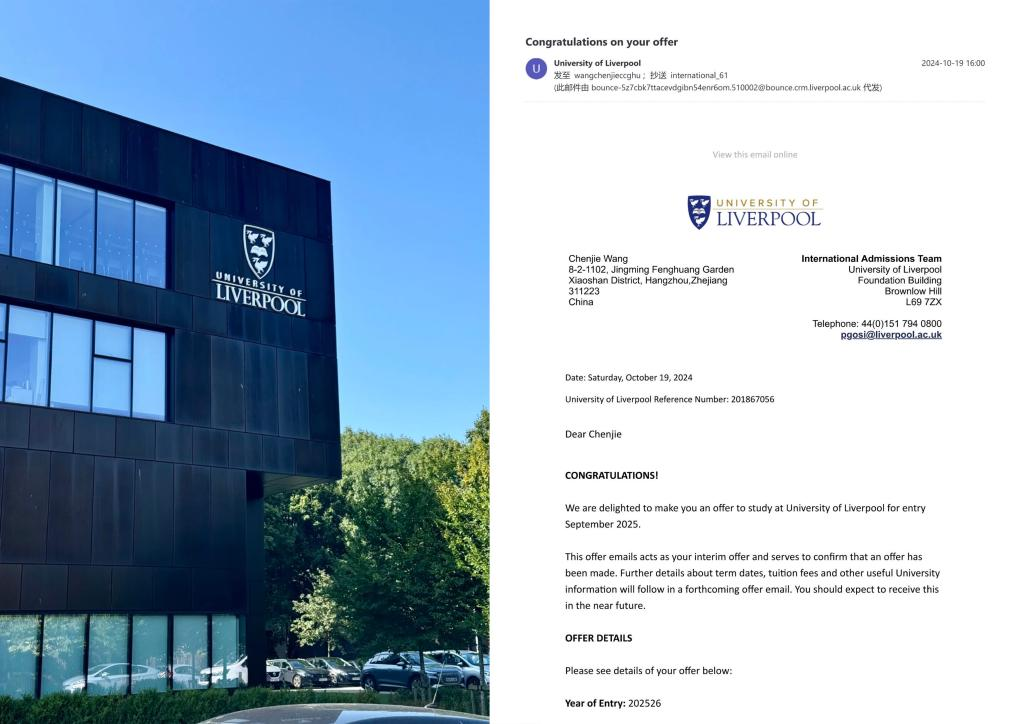 产品设计专业2025届王晨杰同学考取英国利物浦大学硕士研究生。利物浦大学是英国公立研究型大学之一,是一所百年名