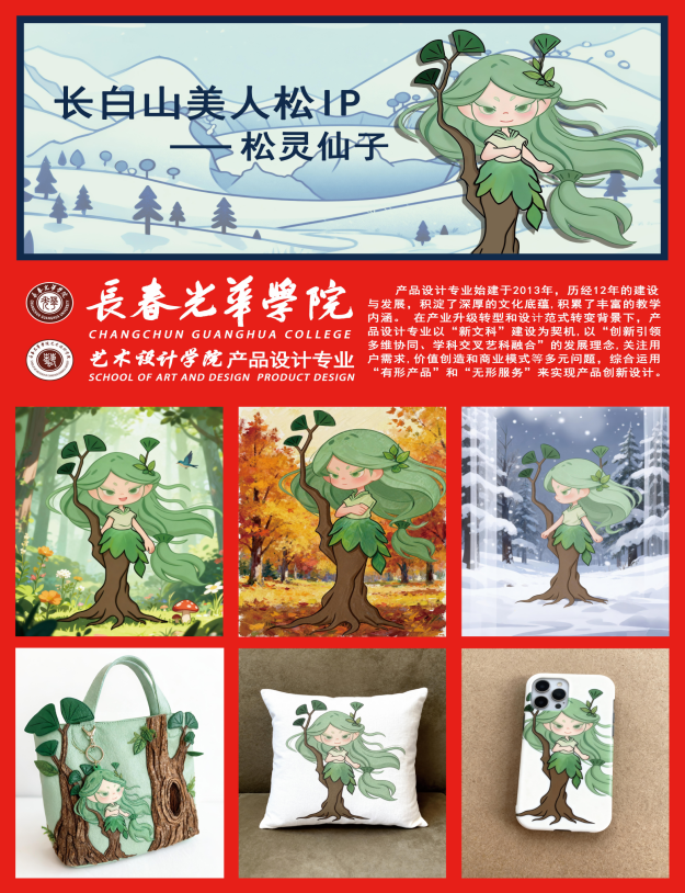 产品设计专业2022 级陈璐琰同学以长白山美人松为设计元素,打造IP系列文创产品,并在马来西亚、泰国等国家展出,同时作为礼物赠送外国友人。