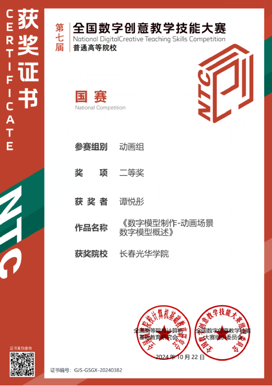 近日,第七届全国数字创意教学技能大赛获奖名单正式揭晓,长春光华学院艺术设计学院数字媒体艺术系教师在本次大赛中表现优异,荣获国赛二等奖两项、三等奖一项,为学校赢得了极高的荣誉。