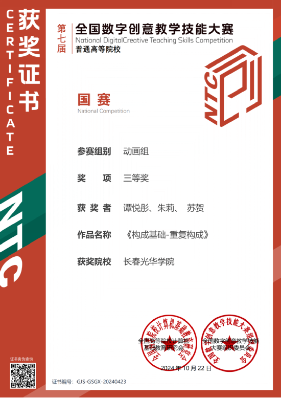此外,谭悦彤教师团队的课程《数字模型制作-动画场景数字模型概述》及《构成基础-重复构成》分别获得了动画组二等奖和三等奖。他们的参赛项目同样在教学理念、课程设计、实践应用等方面展现出了独特的优势和创新点,充分展示了长春光华学院艺术设计学院数字媒体艺术系教师在数字创意教学领域的深厚功底和卓越才华。