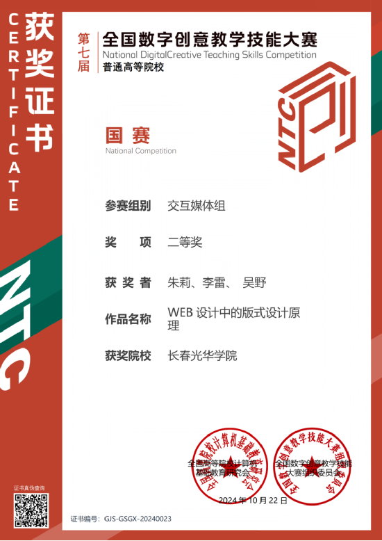 在激烈的角逐中,长春光华学院艺术设计学院数字媒体艺术系的教师们凭借出色的教学设计和卓越的教学成果脱颖而出。其中,朱莉教师带领团队成员李雷及吴野教师凭借课程《WEB设计中的版式设计原理》荣获交互媒体组一等奖,该项目在教学设计方法、教学内容展示、教学技术运用等方面均展现出了高度的创新性和实用性,赢得了评委们的一致好评。