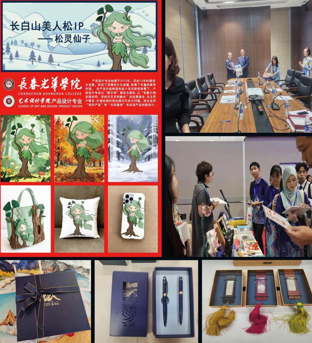 以赛促学、以赛促教、以赛促展、以赛促就业更是本专业教学模式的重要成果载体。产品设计专业师生近三年获得国家级、省级奖项百余项。产品设计专业2022 级陈珂婷同学曾作为获奖学生代表接受中国教育电视台专访,此次专访展示了产品设计专业在传承优秀传统文化,艺术创作与研究的基础上,积极探索设计创新方法的多元化发展教学模式,将设计理念与实践深度融合,课堂教学与实践教学高度良性互动,引导学生以创新性的思维实现价值的创造性;产品设计专业2022 级陈璐琰同学以长白山美人松为设计元素,设计IP系列文创产品,并在马来西亚、泰国等国家展出,同时作为礼物赠送外国友人。实现学校与社会人才对接,使其在知识、能力、素质三方面均得到提升,达到产教融合育人目的、成果得到充分转化,促进了社会经济发展。将企业真实项目引入课堂教学,实现 “学习即实践、毕业即上岗”,实现 “以赛促就业” 的良性循环, 人才培养与企业需求的有效衔接。